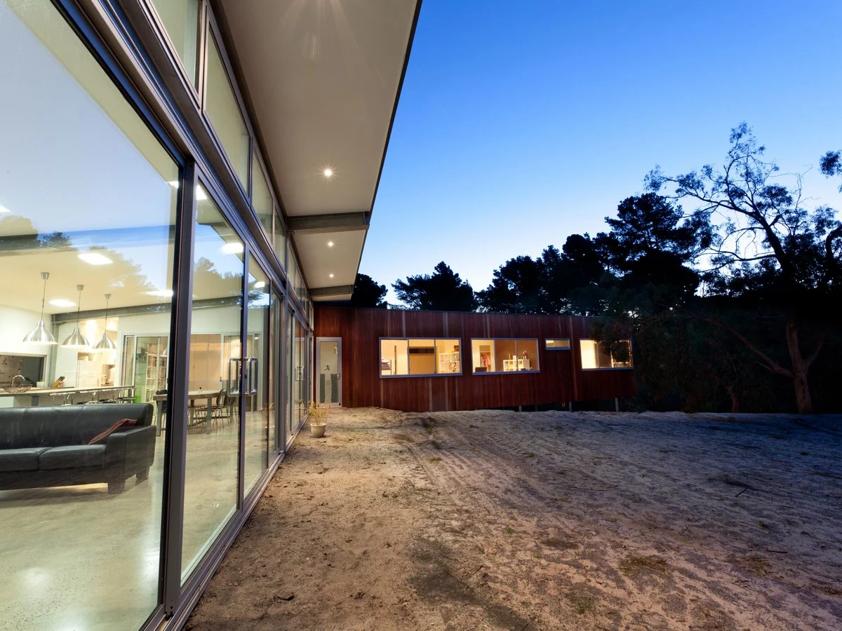 Architectural design featuring rammed earth walls, spotted gum shiplap cladding, commercial windows, polished concrete slab, slab floor heating, exposed steel columns & beams, polished timber floor boards.